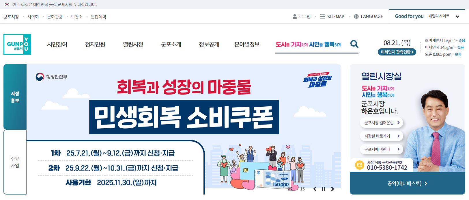 군포시청 홈페이지는 군포시민들이 행정 서비스를 편리하게 이용할 수 있도록 구축된 공식 디지털 플랫폼입니다. 시민의 일상과 밀접한 각종 민원 처리부터 문화예술 프로그램까지 다양한 정보와 서비스를 제공하여 시민 만족도 향상을 위해 지속적으로 발전해 나가고 있습니다.