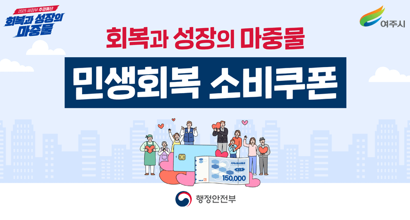 2025 새정부 추경예산 관련 정보와 민생회복 소비쿠폰 신청 및 사용 안내가 홈페이지 메인에 게시되어 있습니다. 이는 코로나19 이후 지역경제 활성화를 위한 여주시의 적극적인 정책 의지를 보여줍니다.