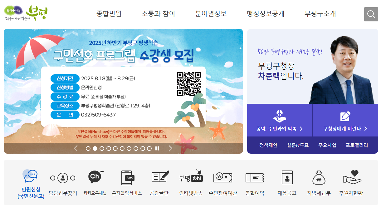 부평구청 홈페이지는 교육, 교통, 경제 등 다양한 분야의 지역정보를 제공합니다: