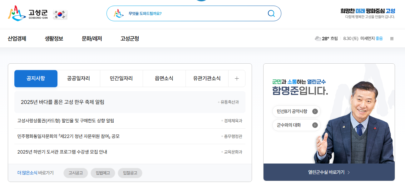 - 소통창구: 군민제안, 주민참여예산, 각종 신고센터 운영