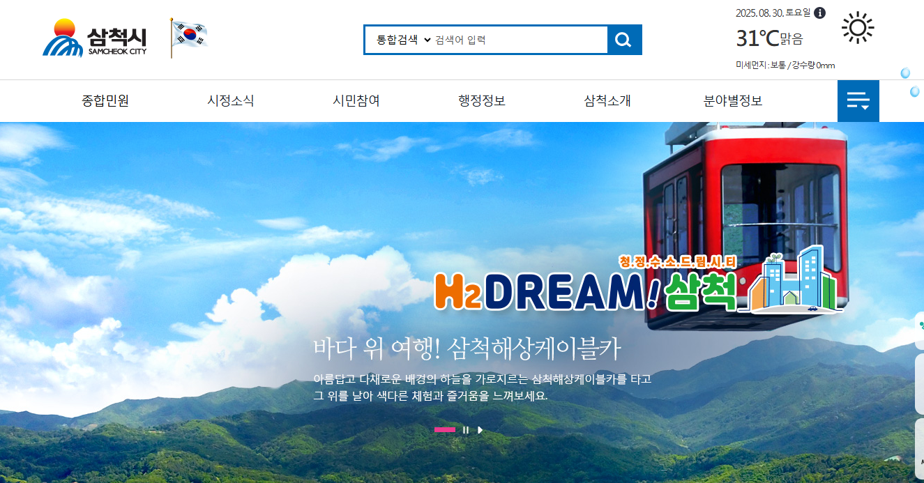 삼척시청 홈페이지(http://www.samcheok.go.kr/)는 시민들의 편의를 위해 다양한 온라인 서비스를 제공합니다. 홈페이지를 통해 접근할 수 있는 주요 서비스는 다음과 같습니다: