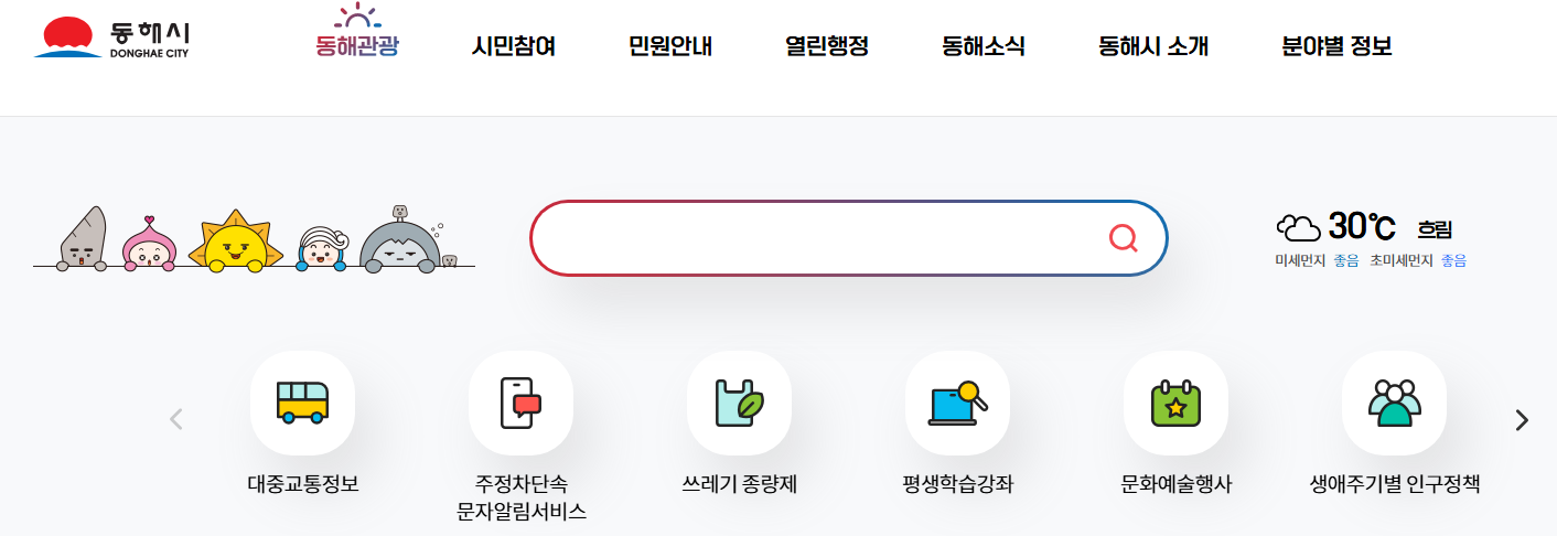동해시청 홈페이지는 시민 중심의 디지털 행정서비스를 제공하는 종합 플랫폼으로, 행정업무부터 관광정보, 교육서비스까지 다양한 분야의 정보를 원스톱으로 제공하고 있습니다. 특히 다국어 지원과 통합검색 시스템을 통해 시민들의 접근성과 편의성을 높이고 있는 것이 특징입니다.