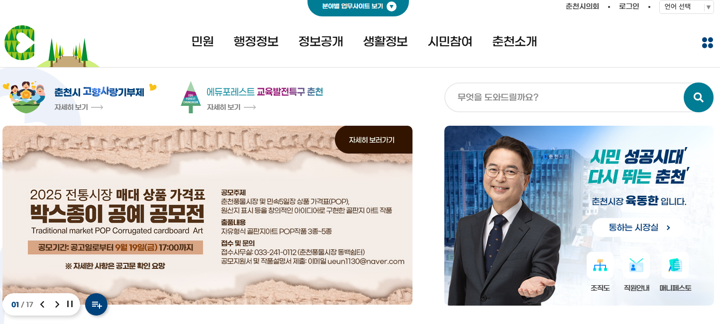 춘천시청 홈페이지에 오신 것을 환영합니다. 춘천시청 민원실, 채용정보, 시청안내, 직원안내, 조직도, 시정소식, 고시/공고 등 춘천시 행정과 생활 정보를 제공하고 있습니다.