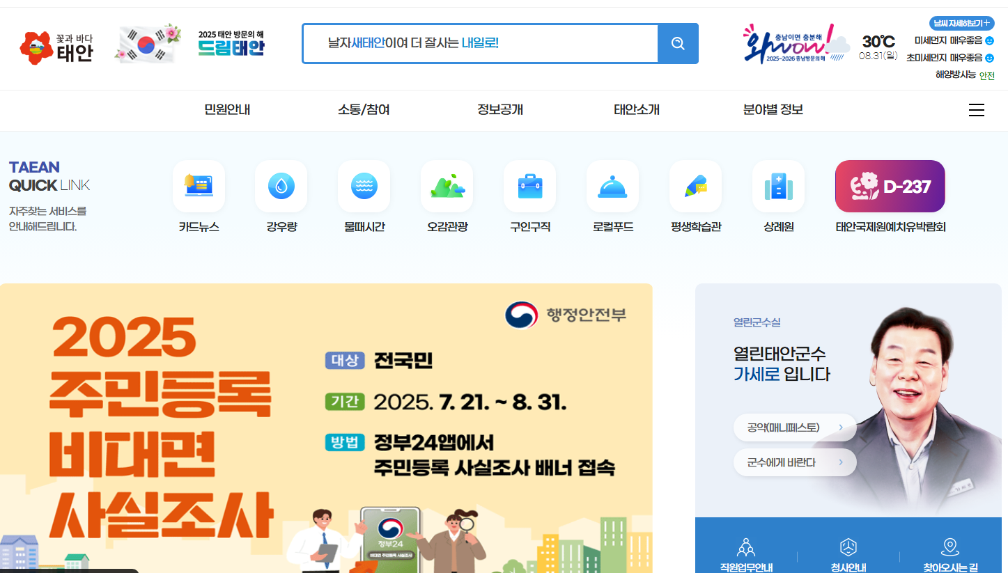 태안군청 홈페이지는 군민들이 편리하게 행정 서비스를 이용할 수 있도록 지속적으로 발전하고 있으며, 투명하고 효율적인 행정 서비스 제공을 위해 노력하고 있습니다.