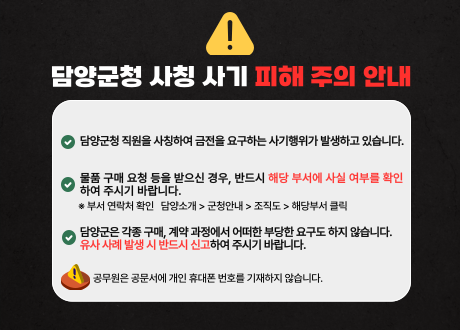 담양군청 홈페이지(www.damyang.go.kr)는 전라남도 담양군의 공식 웹사이트로, 지역 주민과 방문객들에게 종합적인 행정서비스를 제공하는 디지털 플랫폼입니다. 홈페이지 상단에는 검색 기능이 배치되어 사용자가 원하는 정보를 신속하게 찾을 수 있도록 설계되었습니다.