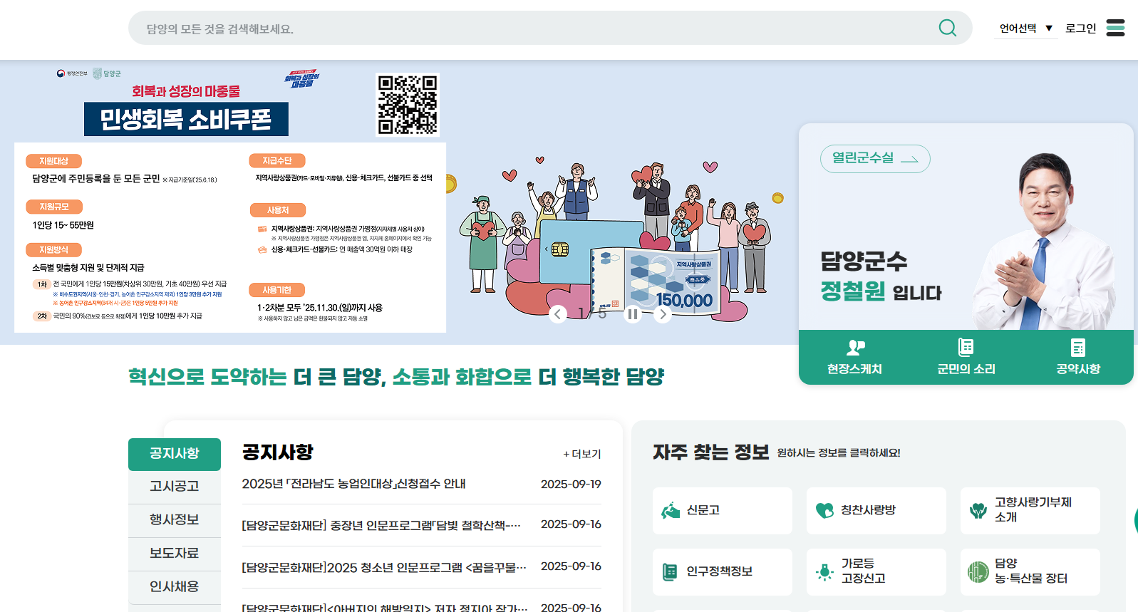 담양군청 홈페이지는 주민들의 일상생활에 필요한 모든 행정서비스를 원스톱으로 제공하는 종합 플랫폼으로 발전하고 있으며, 지속적인 디지털 혁신을 통해 더욱 편리하고 효율적인 서비스를 제공하고 있습니다.