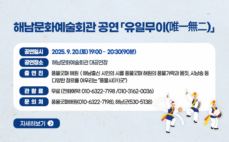 해남군은 문화관광 활성화를 위해 해남문화관광재단을 설립하여 전문적인 문화관광 정책을 수행하고 있습니다. 해남문화예술회관(061-530-5615)을 통해 다양한 문화 행사와 공연 정보를 제공하며, 전용 홈페이지(art.haenam.go.kr)를 통해 상세한 정보를 확인할 수 있습니다.