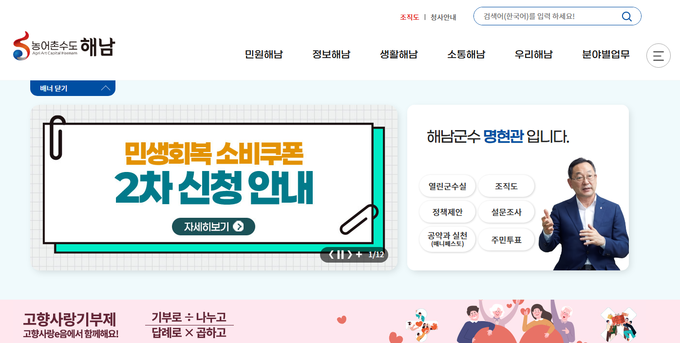 해남군청 홈페이지는 사용자 편의를 고려하여 체계적으로 구성되어 있습니다. 상단 메뉴에는 '생활해남', '민원해남', '소통해남', '분야별정보' 등이 배치되어 있어 군민들이 필요한 정보를 쉽게 찾을 수 있습니다. 각 카테고리별로 세부 서비스가 나누어져 있어 원하는 정보에 빠르게 접근할 수 있는 구조로 설계되었습니다.