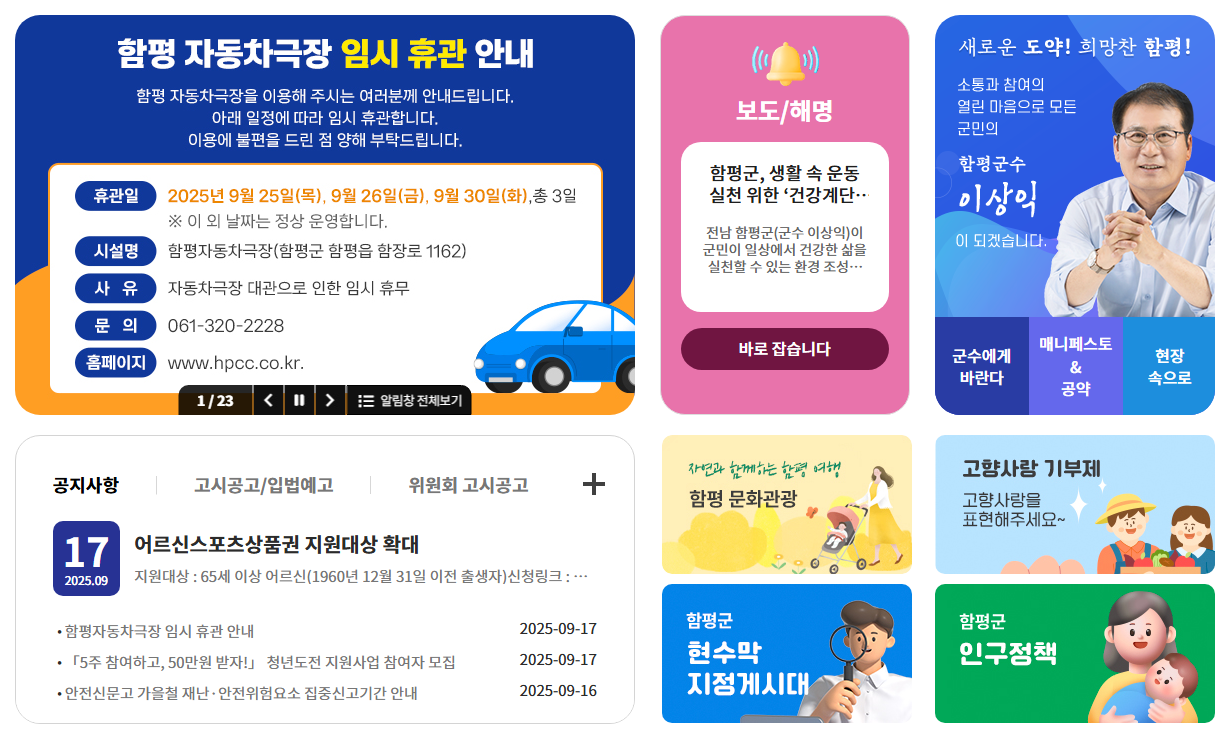 홈페이지는 분야별정보, 함평천지, 민원안내, 소통참여, 함평소식 등의 주요 메뉴로 구성되어 있어 사용자가 필요한 정보를 체계적으로 찾을 수 있습니다. 특히 군민 맞춤형 서비스를 통해 개인별 필요에 따른 정보를 효율적으로 제공하고 있습니다.
