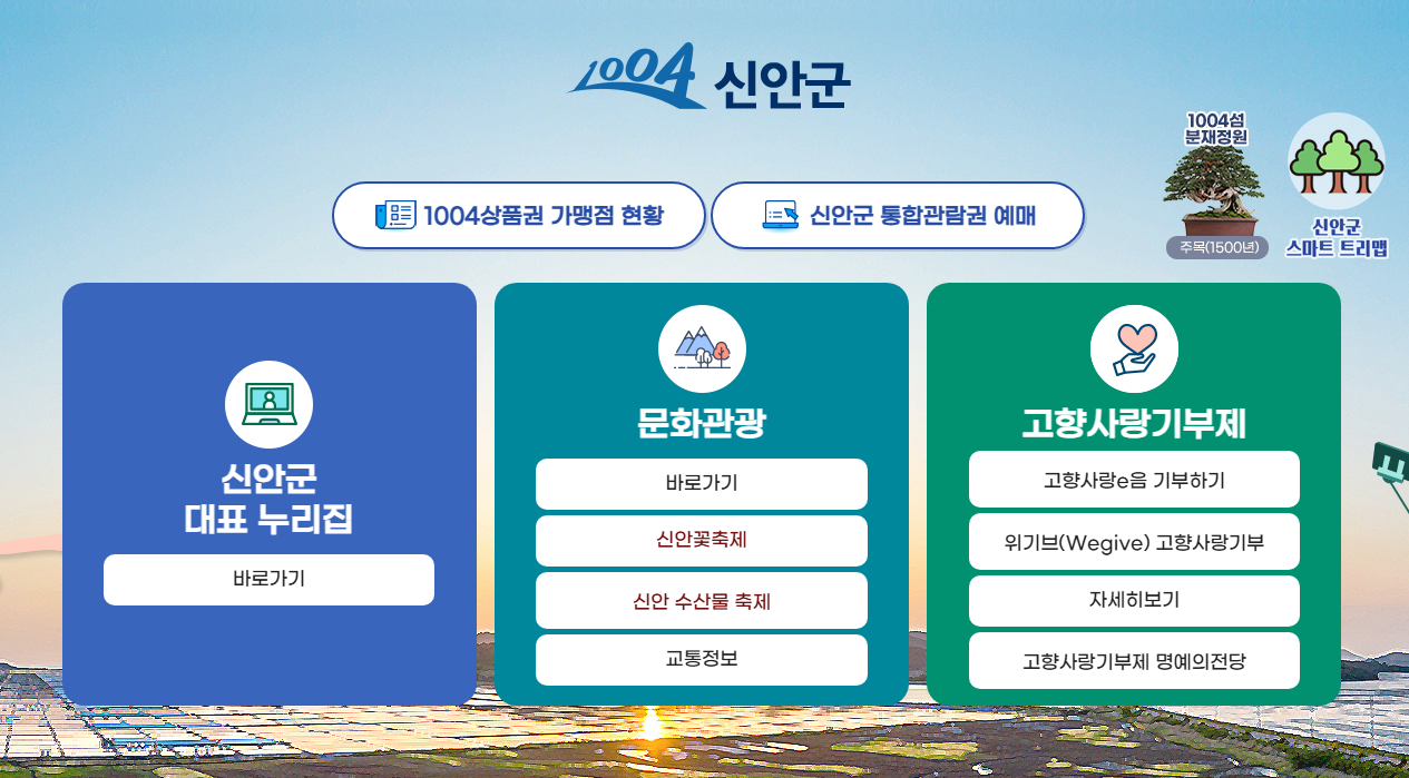 전라남도 신안군의 공식 홈페이지는 1004개의 아름다운 섬으로 이루어진 지역의 다양한 행정서비스와 정보를 제공하는 핵심 플랫폼입니다. 신안군 주민들과 방문객들이 군정 정보, 민원 서비스, 관광 정보 등을 편리하게 이용할 수 있도록 구성되어 있습니다.