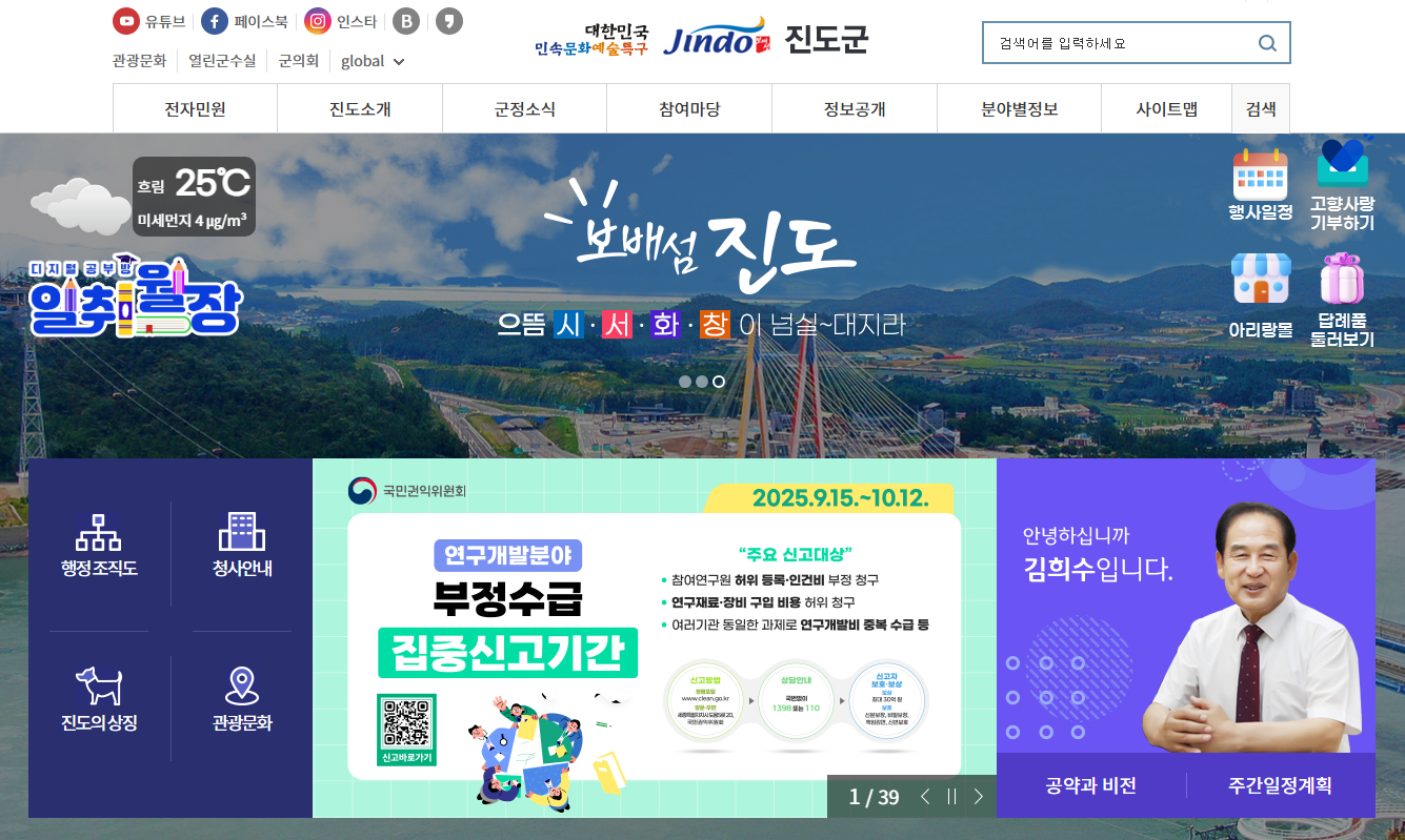 진도군청 홈페이지 (https://www.jindo.go.kr)는 진도군의 공식 온라인 포털로서 다양한 행정서비스를 디지털화하여 제공하는 종합 서비스 플랫폼입니다. 전라남도 진도군 진도읍 철마길 25에 위치한 진도군청이 운영하는 이 홈페이지는 군민들의 편의를 위해 24시간 언제든지 접근 가능한 온라인 서비스를 제공하고 있습니다.