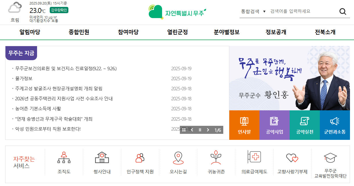 무주군청 홈페이지(www.muju.go.kr)는 전라북도 무주군의 공식 웹사이트로서, 약 2만 5천여 군민과 연간 수많은 관광객에게 디지털 행정 서비스를 제공하는 핵심 플랫폼이다.