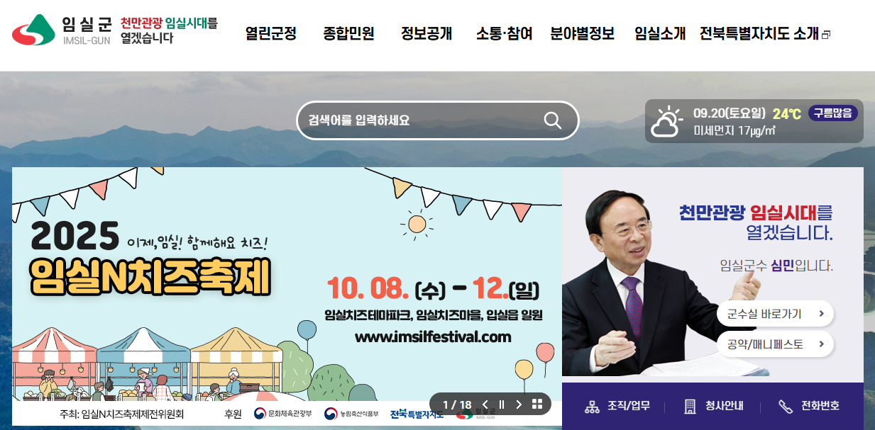임실군청 홈페이지 (www.imsil.go.kr)는 인구 약 25,604명의 임실군민들을 위한 통합 행정서비스 포털입니다. 이 웹사이트는 전자민원, 열린군정, 참여마당, 문화관광, 정보공개, 산업경제, 임실소개 등 7개 주요 메뉴로 구성되어 있으며, 군청의 모든 업무를 디지털화하여 제공합니다.
