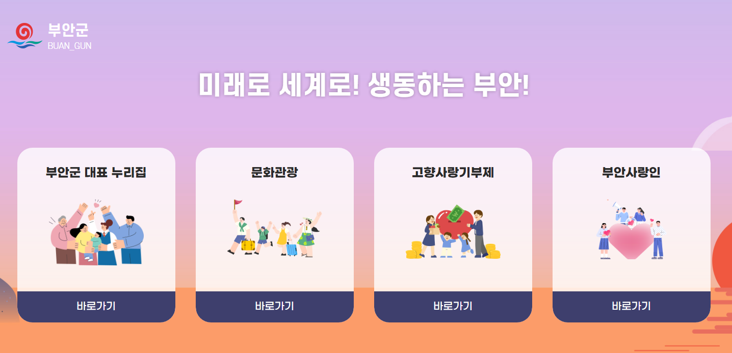 부안군청 홈페이지(www.buan.go.kr)는 "미래로 세계로! 생동하는 부안!"이라는 비전 아래 운영되는 공식 누리집입니다. 전북특별자치도 남서쪽 변산반도에 위치한 부안군의 행정업무를 온라인으로 제공하며, 군민들의 편의성 향상을 위해 다양한 디지털 서비스를 운영하고 있습니다.