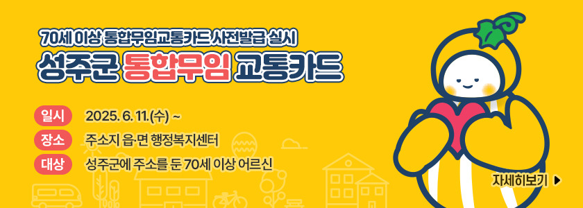성주군청은 "신속·정확·친절"을 모토로 한 통합행정서비스 헌장을 통해 군민 모두가 신뢰할 수 있는 행정 서비스 제공을 약속하고 있습니다. 홈페이지를 통한 디지털 행정 혁신으로 군민 중심의 맞춤형 서비스 구현에 지속적으로 노력하고 있습니다.