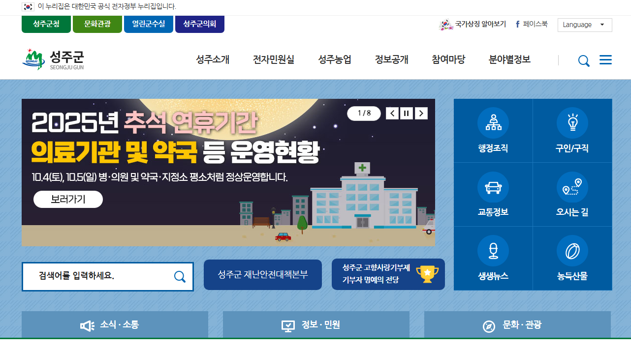 성주군청 홈페이지는 경상북도 성주군의 행정 업무와 다양한 민원 서비스를 디지털로 제공하는 온라인 플랫폼입니다. 홈페이지를 통해 군민들이 더 편리하고 효율적으로 행정 서비스를 이용할 수 있도록 구성되어 있습니다.