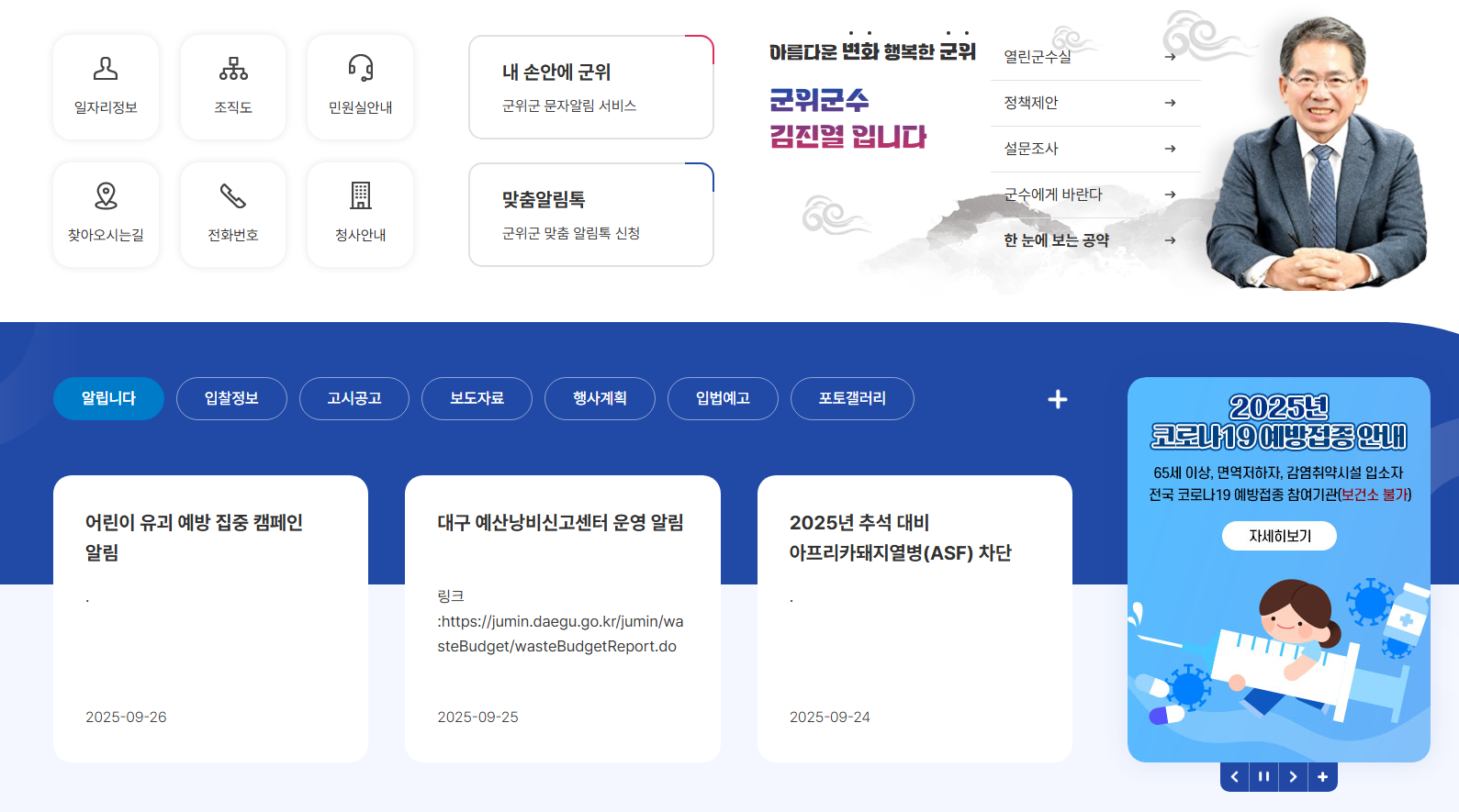 현대 사회에서 지방자치단체의 홈페이지는 행정서비스의 디지털화와 민원처리의 효율성을 높이는 핵심 플랫폼 역할을 하고 있습니다. 군위군청 홈페이지는 대구광역시 군위군민들에게 다양한 온라인 행정서비스와 지역정보를 제공하는 중요한 창구로 기능하고 있습니다. 본 글에서는 군위군청 홈페이지의 구성과 서비스 내용을 상세히 살펴보겠습니다.