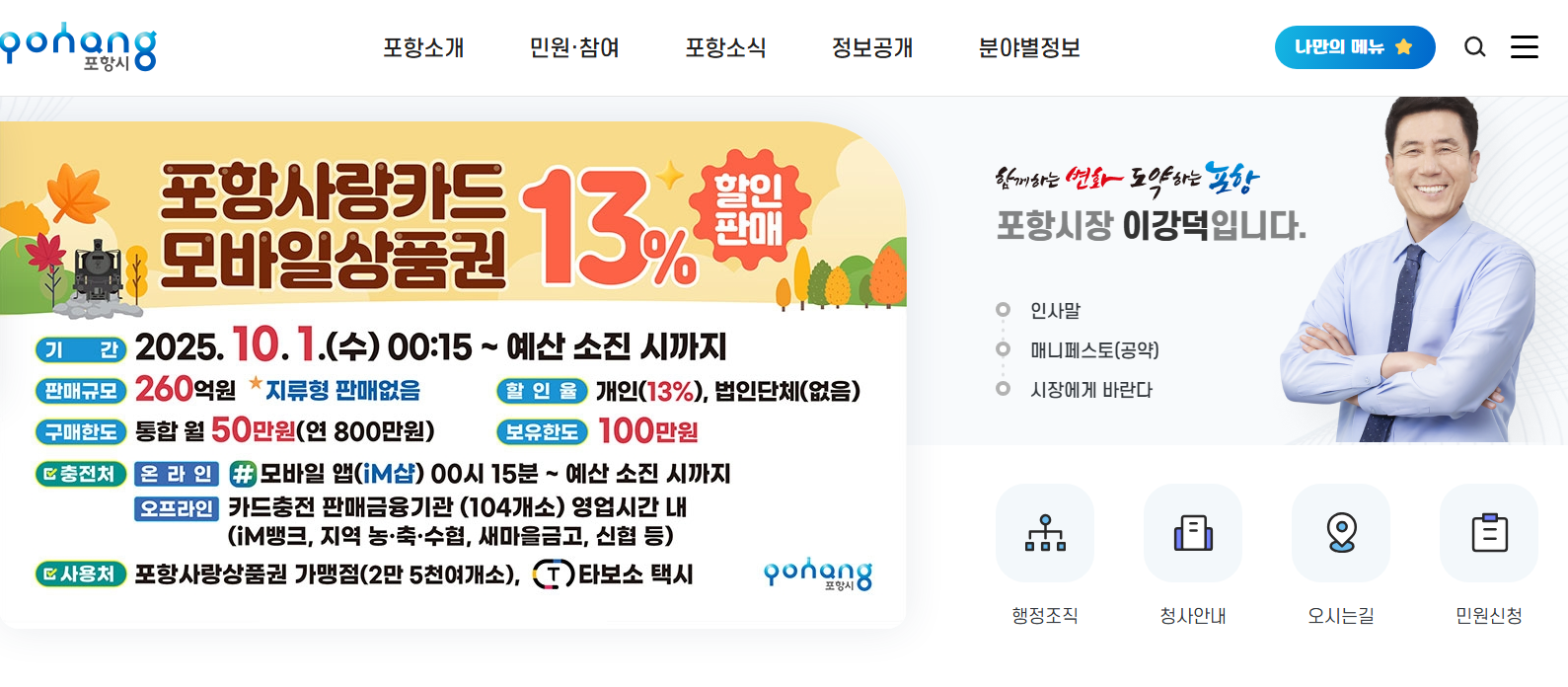 포항시청 홈페이지 (www.pohang.go.kr)는 포항시 남구 대이동에 위치한 포항시청이 운영하는 공식 웹사이트입니다. 시민들이 일상생활에서 필요한 행정 서비스와 정보를 온라인으로 쉽게 이용할 수 있도록 설계된 종합 포털입니다. 현재 시장인 이강덕의 지휘 하에 시민 중심의 디지털 행정 서비스를 구현하고 있습니다.