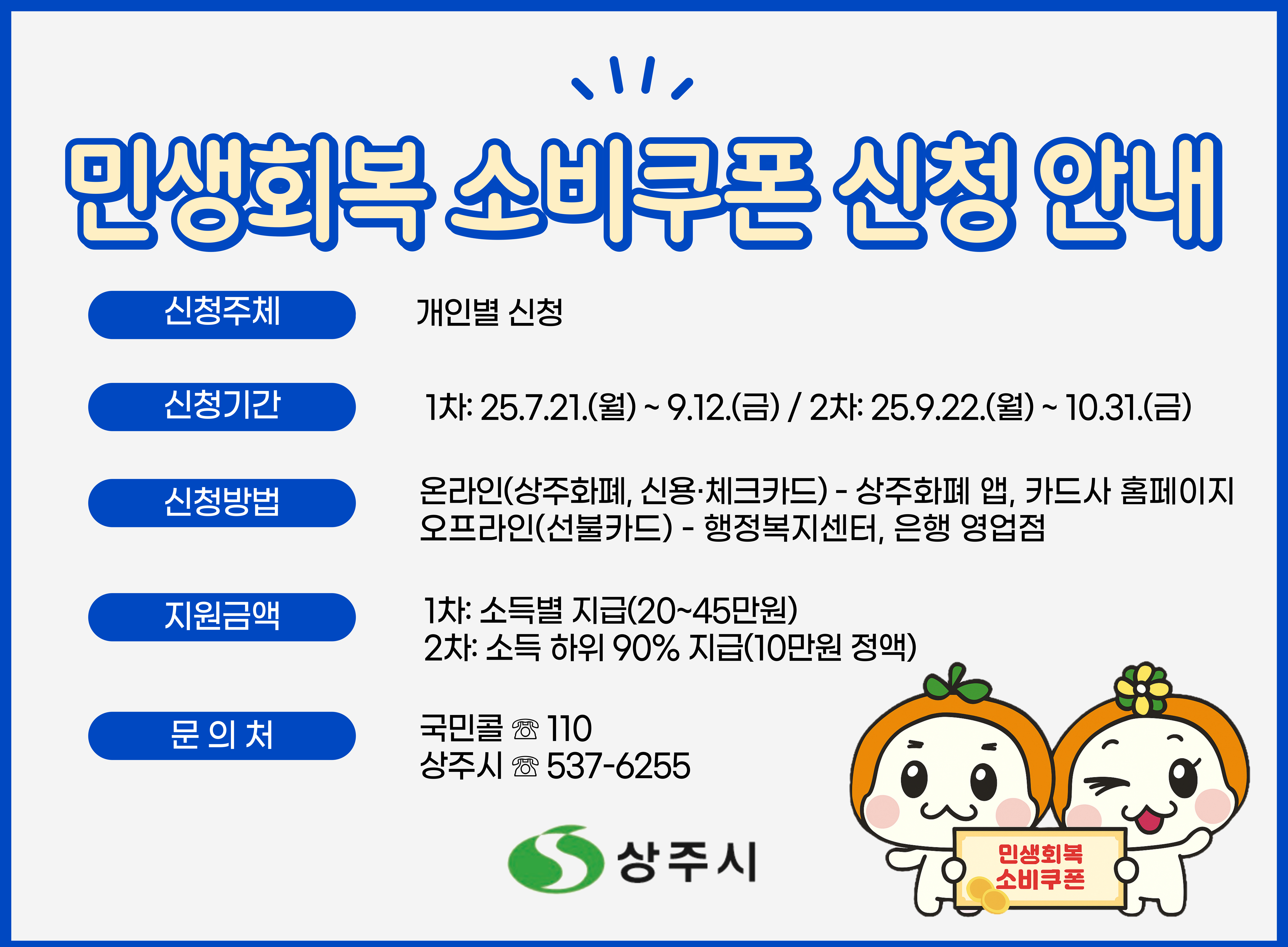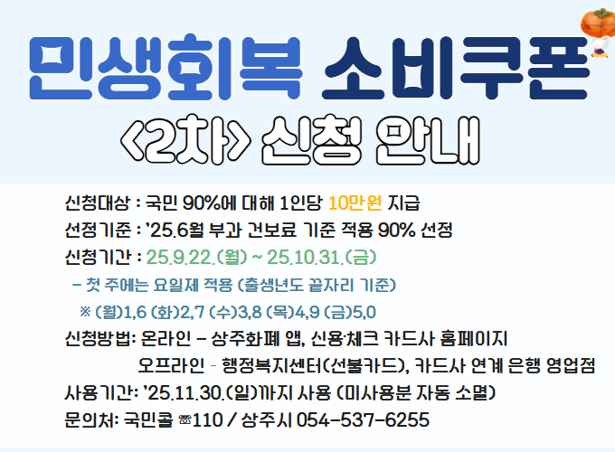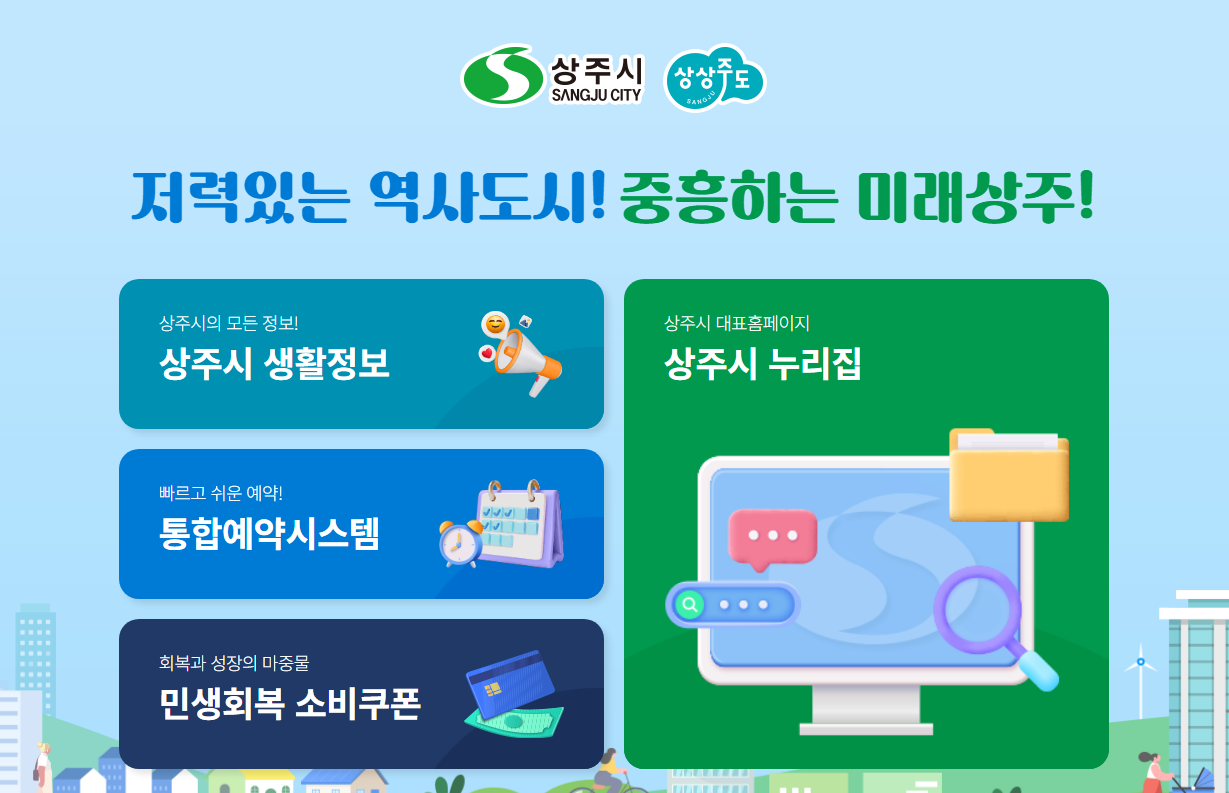 상주시는 "회복과 성장의 마중물"이라는 취지로 민생회복 소비쿠폰 서비스를 운영하고 있습니다. 이는 지역경제 활성화와 시민 생활 지원을 위한 정책의 일환으로, 홈페이지를 통해 관련 정보를 확인할 수 있습니다.