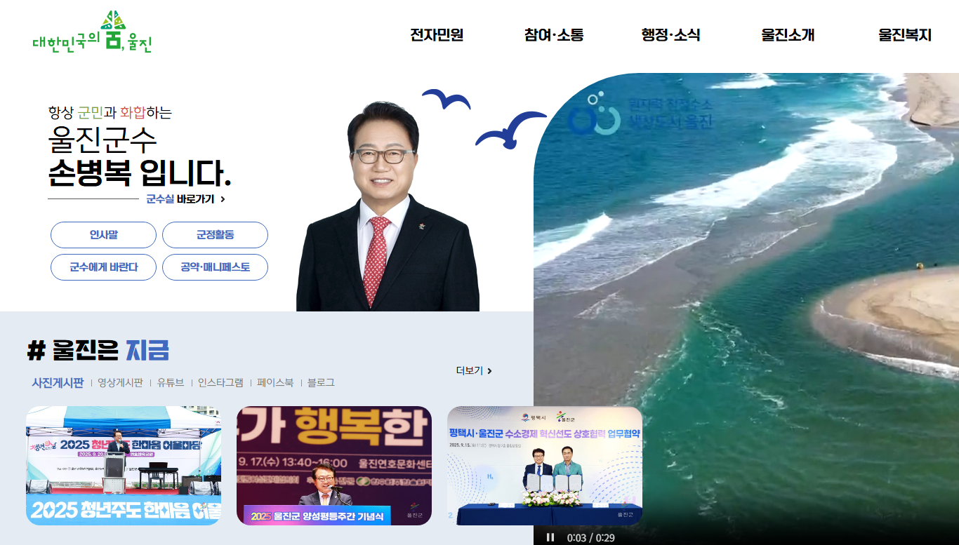 홈페이지는 전자민원, 참여소통, 행정소식, 울진소개, 울진복지, 분야별정보 등 다양한 메뉴로 구성되어 있습니다. 각 메뉴는 울진군의 다양한 서비스를 제공하며, 주민들이 필요한 정보를 쉽게 찾을 수 있도록 체계적으로 설계되었습니다.