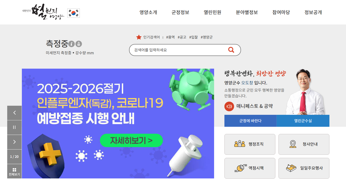 영양군청 홈페이지(www.yyg.go.kr)는 경상북도 영양군이 운영하는 공식 누리집으로, 전자민원, 참여마당, 행정정보, 복지·생활, 으뜸영양고추, 영양소개, 정보공개 등 다양한 정보를 제공하는 종합 행정서비스 플랫폼입니다. 홈페이지는 군민들의 편의를 위해 2017년에 대규모 개편을 실시했으며, 보다 효과적인 문화관광 정보 및 군정 안내를 위해 지속적으로 개선되고 있습니다.