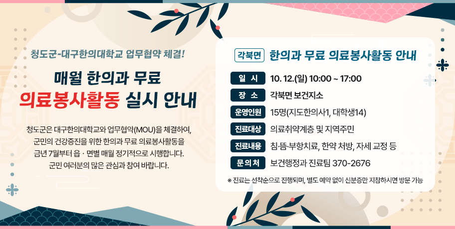 청도군의 다양한 분야별 정보를 제공하는 메뉴를 통해 복지, 농업, 환경, 교육 등 주민 생활에 필수적인 정보를 쉽게 찾아볼 수 있습니다. 분야별로 최신 정보와 정책들이 정리되어 있어 필요한 정보를 빠르게 얻을 수 있으며, 각 분야별로 체계적으로 구성된 메뉴를 통해 원하는 정보를 효율적으로 검색할 수 있습니다.