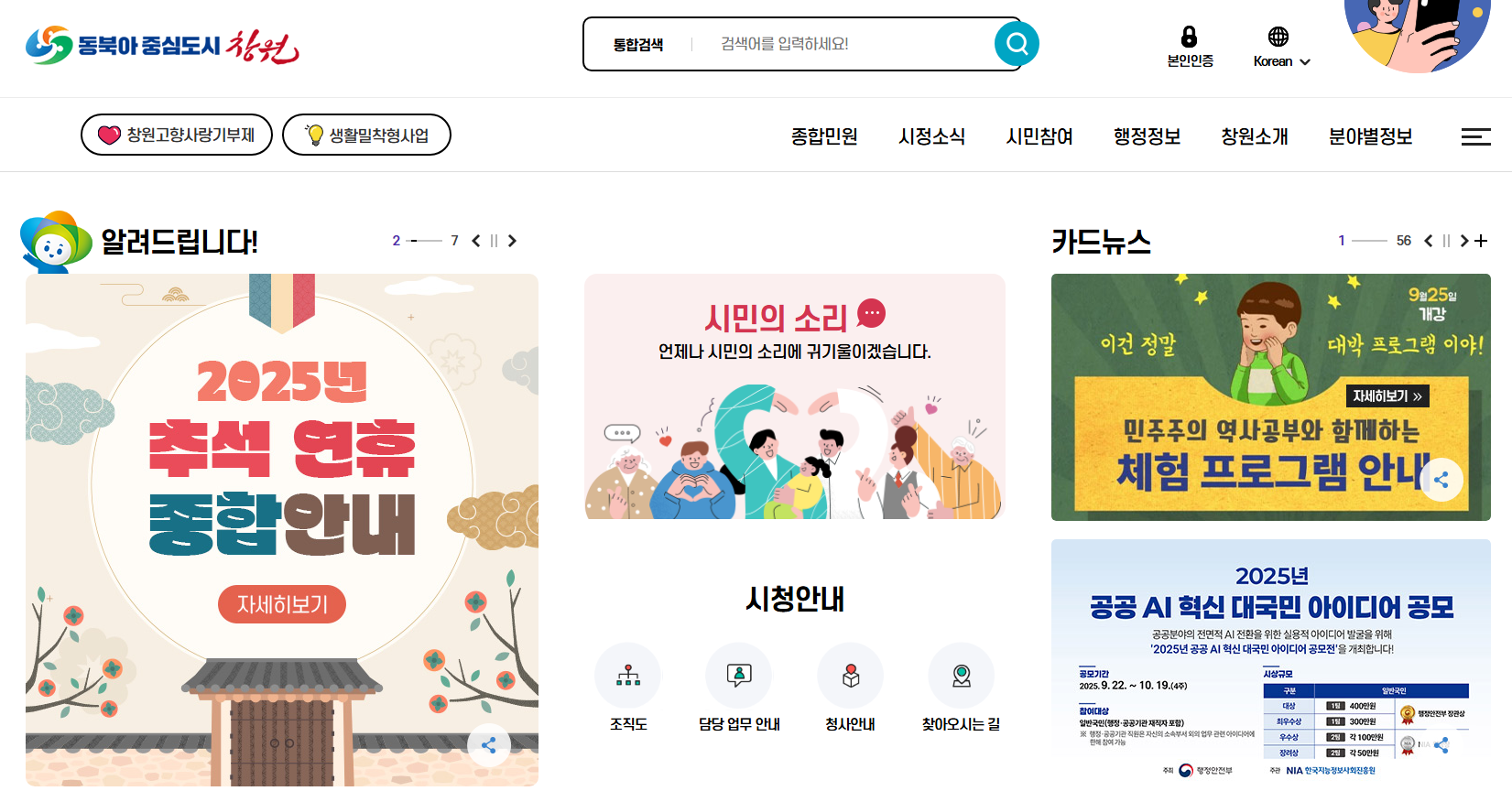 창원시청 홈페이지(www.changwon.go.kr)는 대한민국 공식 전자정부 누리집으로 운영되는 창원특례시의 대표 웹사이트입니다. 1980년 창원시 설립과 함께 시작된 창원시청의 행정서비스를 디지털 환경에 맞게 구현한 온라인 플랫폼으로, 반응형 웹 기반으로 구축되어 PC와 모바일 환경에서 모두 최적화된 서비스를 제공합니다.