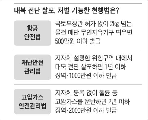 현재 경찰은 항공안전법, 재난안전법, 고압가스안전관리법 등 기존 법령을 적용해 대북전단을 단속하고 있습니다. 항공안전법의 경우 국토교통부 장관 허가 없이 2kg 이상의 물건을 매달고 무인 자유 기구를 날리면 500만원 이하 벌금에 처하도록 규정하고 있습니다.