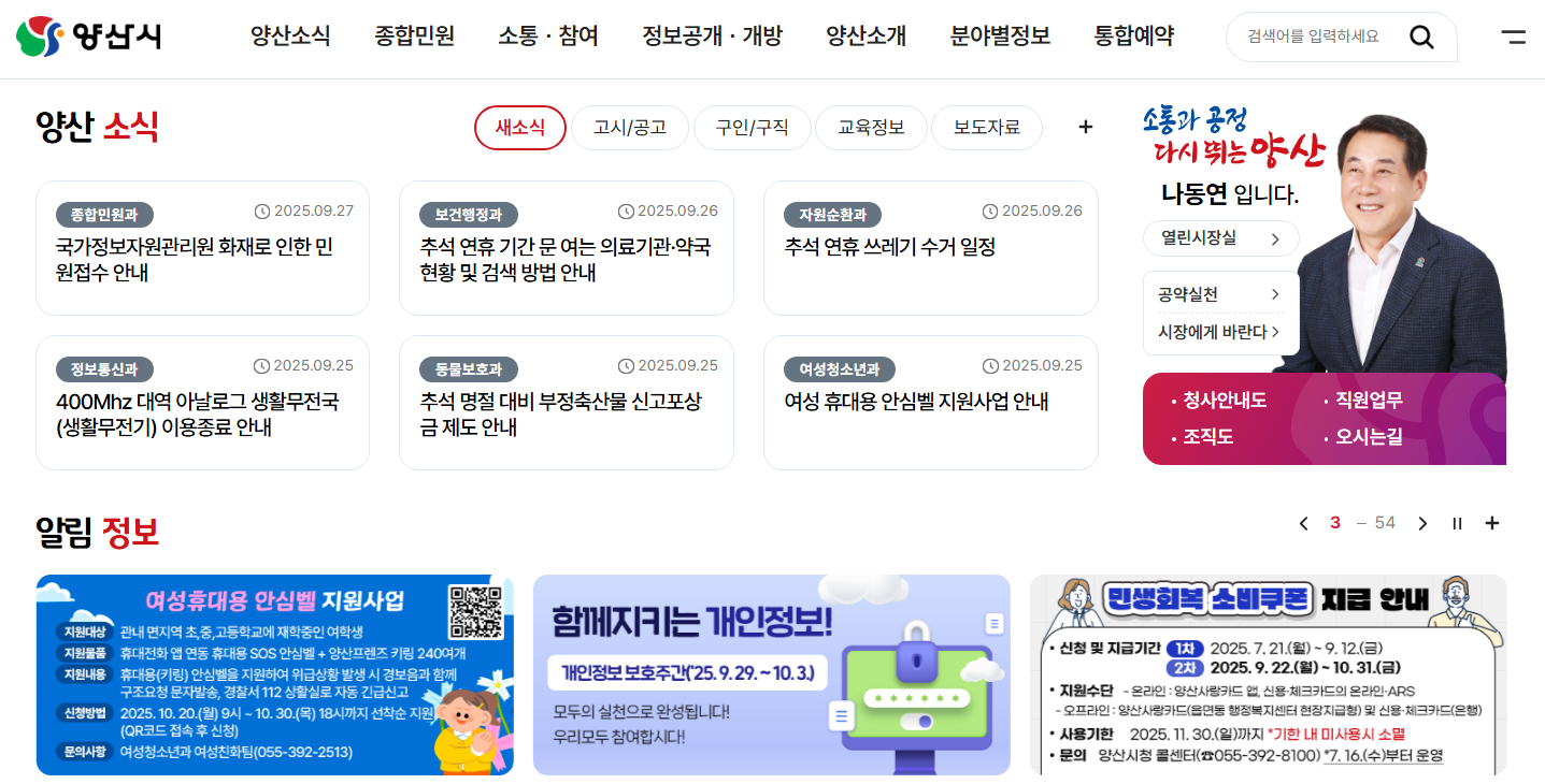 양산시청 홈페이지