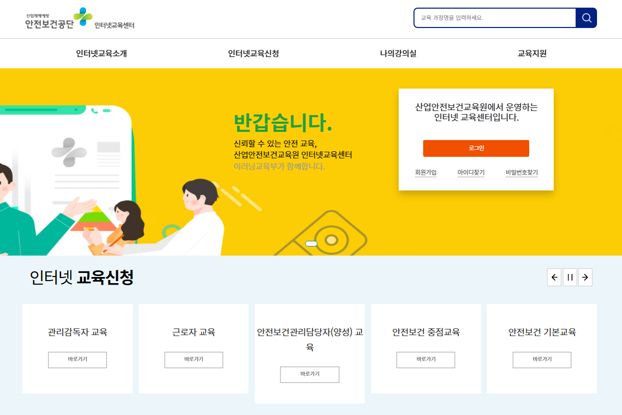 넓은 지식, 안전한내일을 위한 출발점 당신의 안전한 학습 여정을 위한 안전보건교육 통합 교육센터안전보건교육플랫폼에 오신것을 환영합니다.