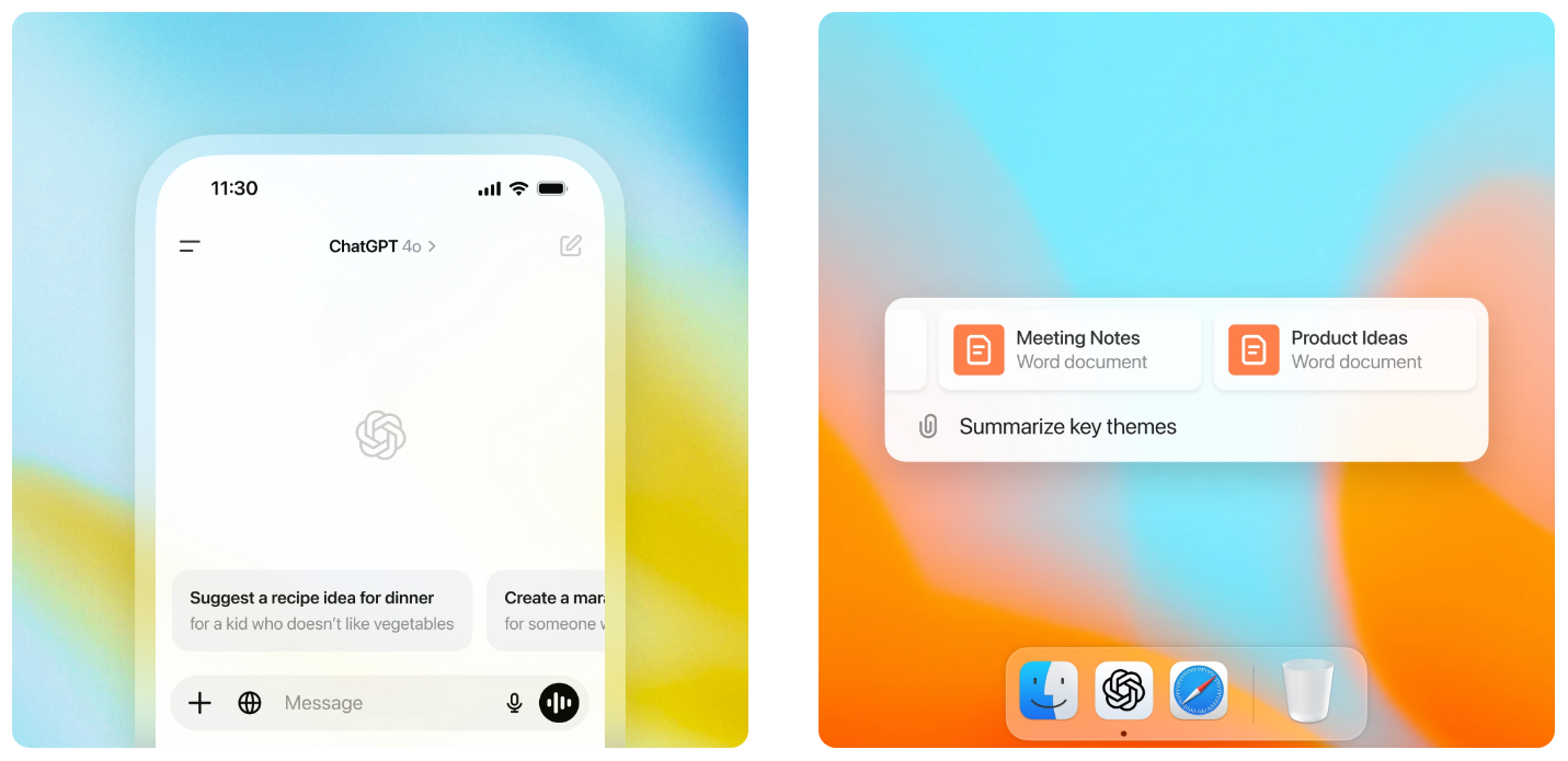 macOS 데스크톱 앱은 Apple Silicon (M1 이상)이 탑재된 macOS 14 이상에서만 사용 가능합니다. 화면의 내용에 대해 직접 대화하고, 이메일이나 스크린샷 같은 항목에 대해 채팅할 수 있습니다.