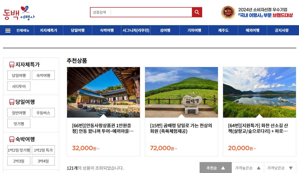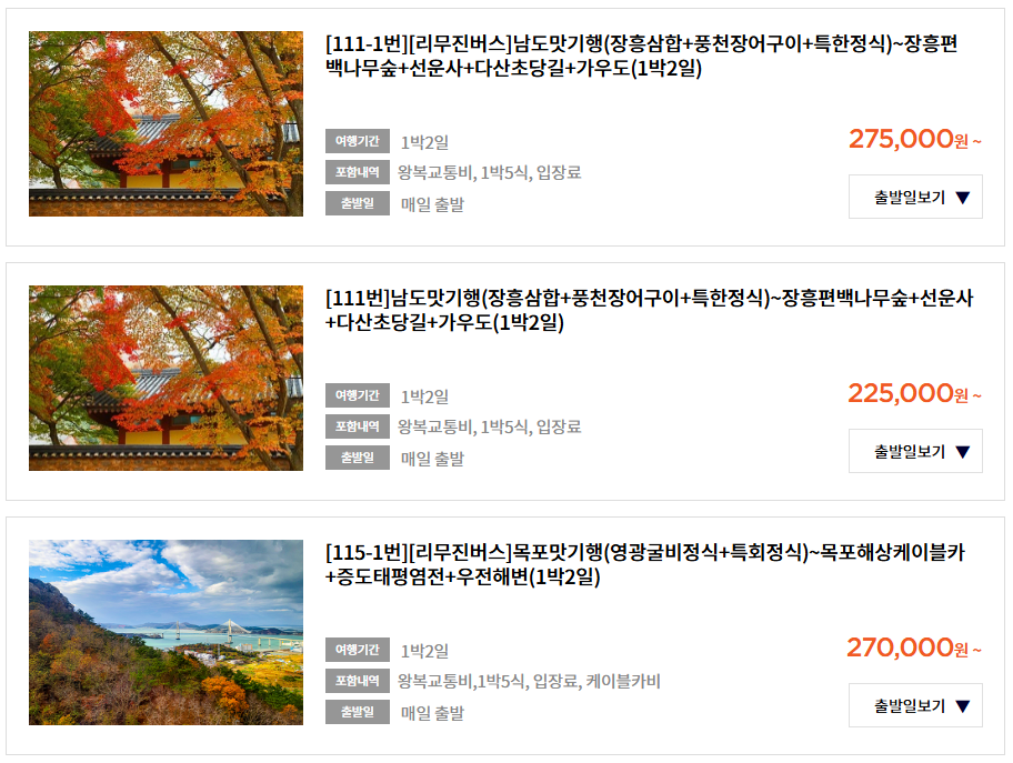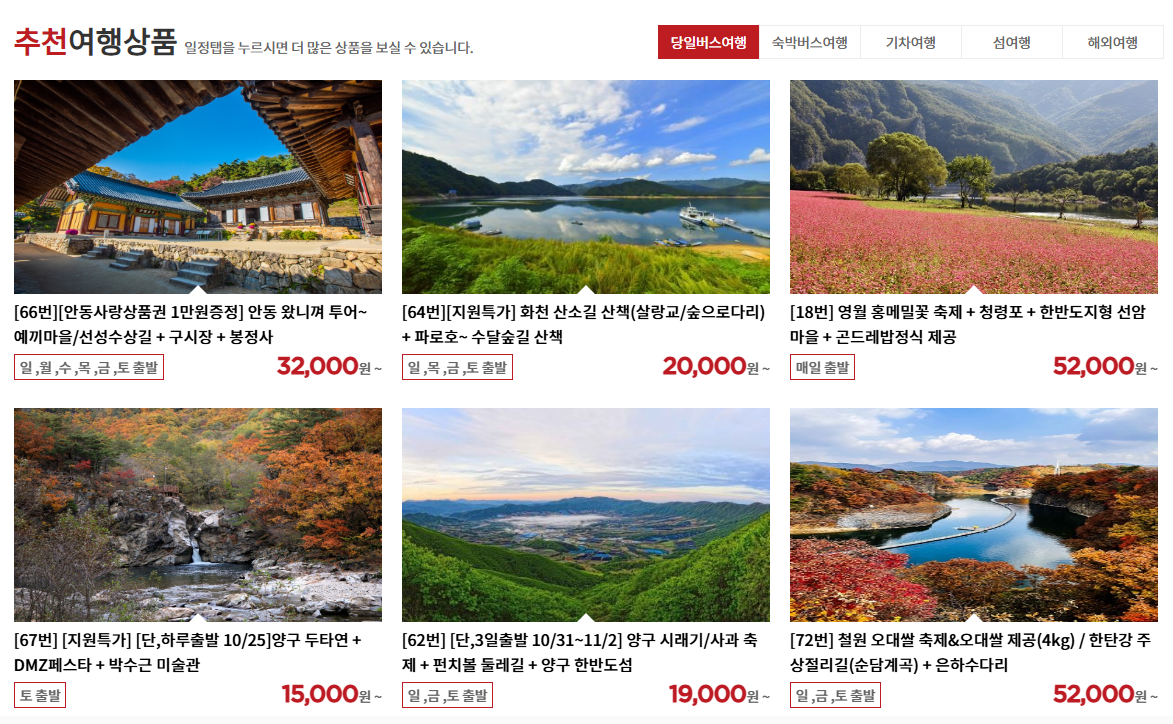 - 숙박여행: 1박2일, 2박3일 등 숙박을 포함한 여행 상품으로, 맛기행, 특가 상품 등이 마련되어 있습니다.