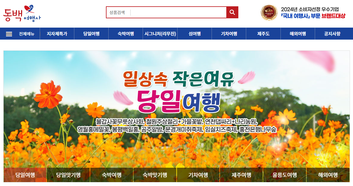 동백여행사는 1994년에 설립된 국내 전문 여행사로, 서울 동대문구에 본사를 두고 있습니다. 특히 당일치기 여행, 숙박형 여행, 섬여행, 기차여행 등 다양한 국내 여행 상품을 제공하며, 온라인 예약 시스템을 통해 고객의 편의를 높이고 있습니다.