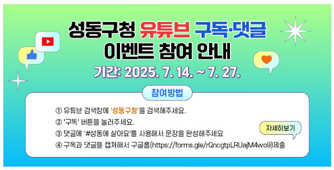 성동구청은 또한 YouTube 채널인 '성동구청 인터넷방송국'을 운영하여 다양한 구정 소식과 정보를 영상으로 제공하고 있습니다. 이를 통해 주민들이 더욱 친근하게 구정 소식을 접할 수 있도록 하고 있습니다.
