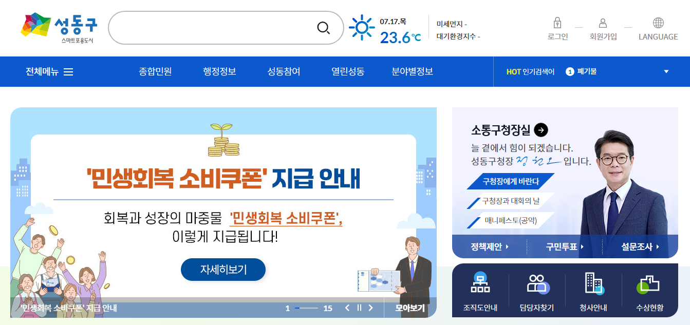성동구청 홈페이지는 주민들의 삶의 질 향상을 위해 지속적으로 서비스를 개선하고 있으며, 다양한 온라인 채널을 통해 주민들과 소통하며 더 나은 행정서비스를 제공하기 위해 노력하고 있습니다.