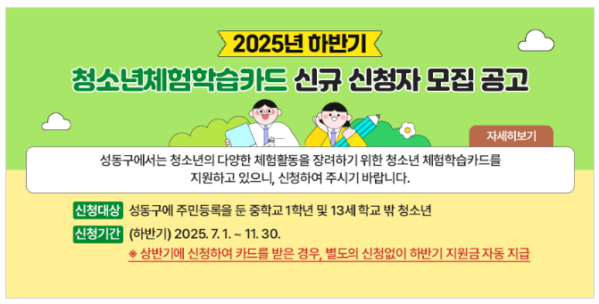 2025년 청년도전 지원사업 참여자 모집, 성년출발지원금 신청, 청소년체험학습카드 신청 등 다양한 청년 지원 프로그램 정보를 제공합니다. 특히 성동구청년지원센터와 연계하여 청년들의 취업과 창업을 지원하는 다양한 서비스를 안내하고 있습니다.