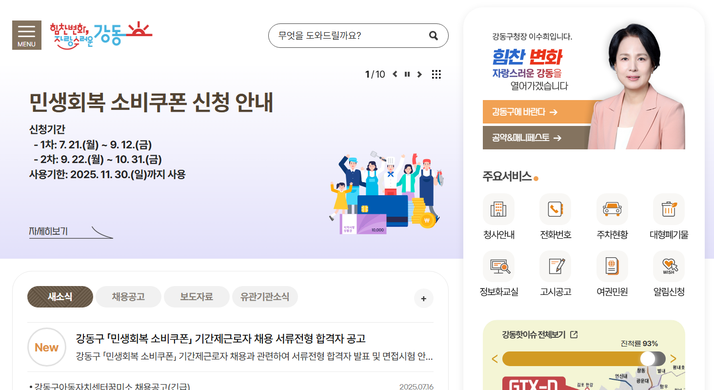 강동구청 홈페이지 (https://www.gangdong.go.kr)는 대한민국 공식 전자정부 누리집으로, 강동구 주민들의 행정 편의를 위한 다양한 온라인 서비스를 제공합니다. 홈페이지는 구청, 보건소, 구의회, 그리고 각 부서별 홈페이지로 구성되어 있으며, 가족정책과, 감사담당관, 건강증진과, 건축과, 건축안전센터, 공동주택과, 교육지원과, 교통행정과 등 다양한 부서의 정보를 제공합니다.