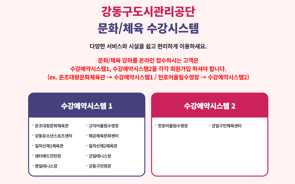 강동구도시관리공단에서 운영하는 문화/체육 수강시스템을 통해 주민들은 다양한 문화 및 체육 강좌를 온라인으로 신청할 수 있습니다. 이 시스템은 구민들의 문화 생활 향상과 건강 증진에 기여하고 있습니다.