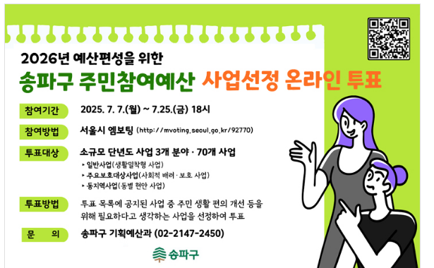 송파구는 환경보호를 위한 다양한 행사를 개최하고 있습니다. 잠실본동에서는 '함께 지키는 지구환경사랑 공모전'을 개최하여 주민들의 환경에 대한 관심을 높이고 있으며, 관련 정보는 송파구청 홈페이지에서 확인할 수 있습니다.