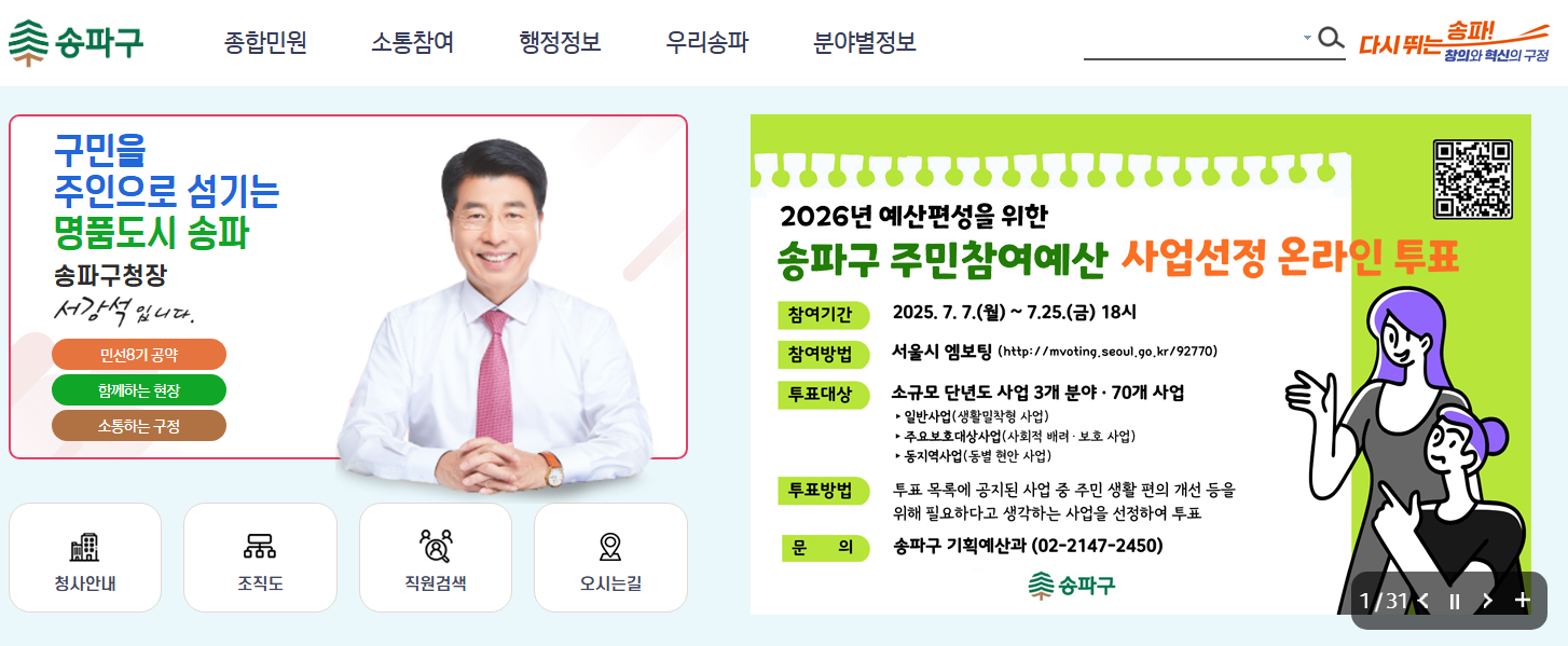 송파구청 홈페이지 (www.songpa.go.kr)는 송파구민들이 각종 행정서비스를 온라인으로 이용할 수 있도록 구축된 통합 플랫폼입니다. 홈페이지는 주민들의 편의성을 높이기 위해 다양한 메뉴와 서비스를 체계적으로 구성하고 있습니다.