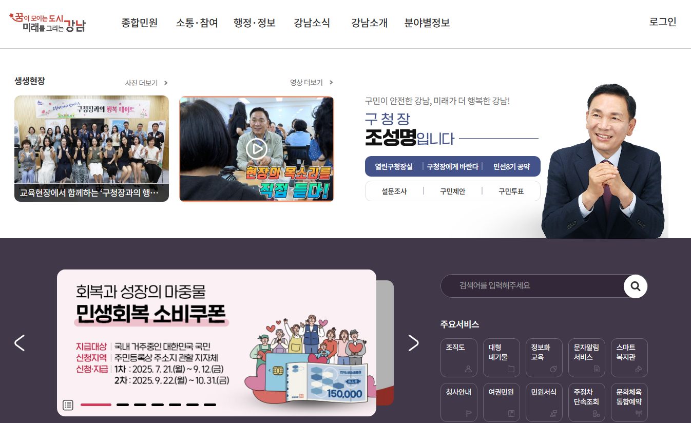 강남구청 홈페이지는 사용자 친화적인 인터페이스로 구성되어 있으며, 다양한 연령층의 구민들이 쉽게 접근할 수 있도록 설계되었습니다. 특히 민생회복 소비쿠폰 같은 생활 밀착형 정책 정보를 국내 거주 중인 대한민국 국민들에게 제공하고 있습니다.