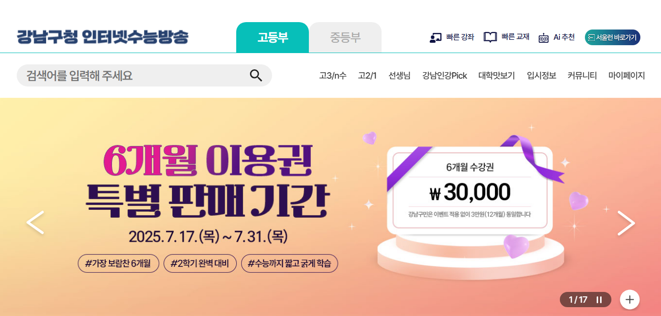 중등부와 고등부 과정을 모두 제공하며, 학생들은 강남구청 인터넷수능방송 홈페이지(edu.ingang.go.kr)를 통해 수강할 수 있습니다. 이 플랫폼은 다양한 교과목의 강의를 제공하여 학생들의 학습 능력 향상에 기여하고 있습니다.