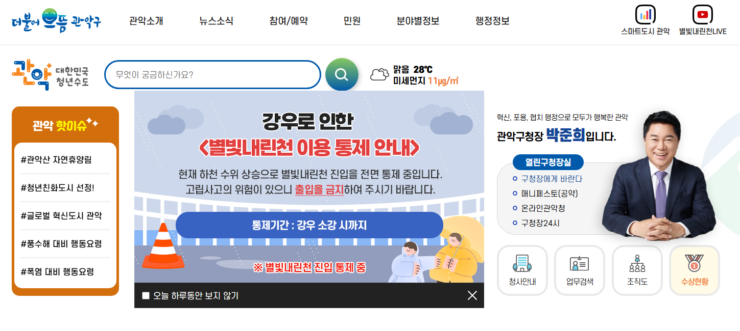 관악구청 홈페이지는 구민의 행정 접근성을 높이기 위해 다양한 디지털 서비스를 통합한 플랫폼으로, 민원처리, 생활 정보, 문화 프로그램 등 다양한 서비스를 원스톱으로 제공하고 있습니다. 지속적인 업데이트와 개선을 통해 주민들에게 더 나은 행정 서비스를 제공하기 위해 노력하고 있습니다.