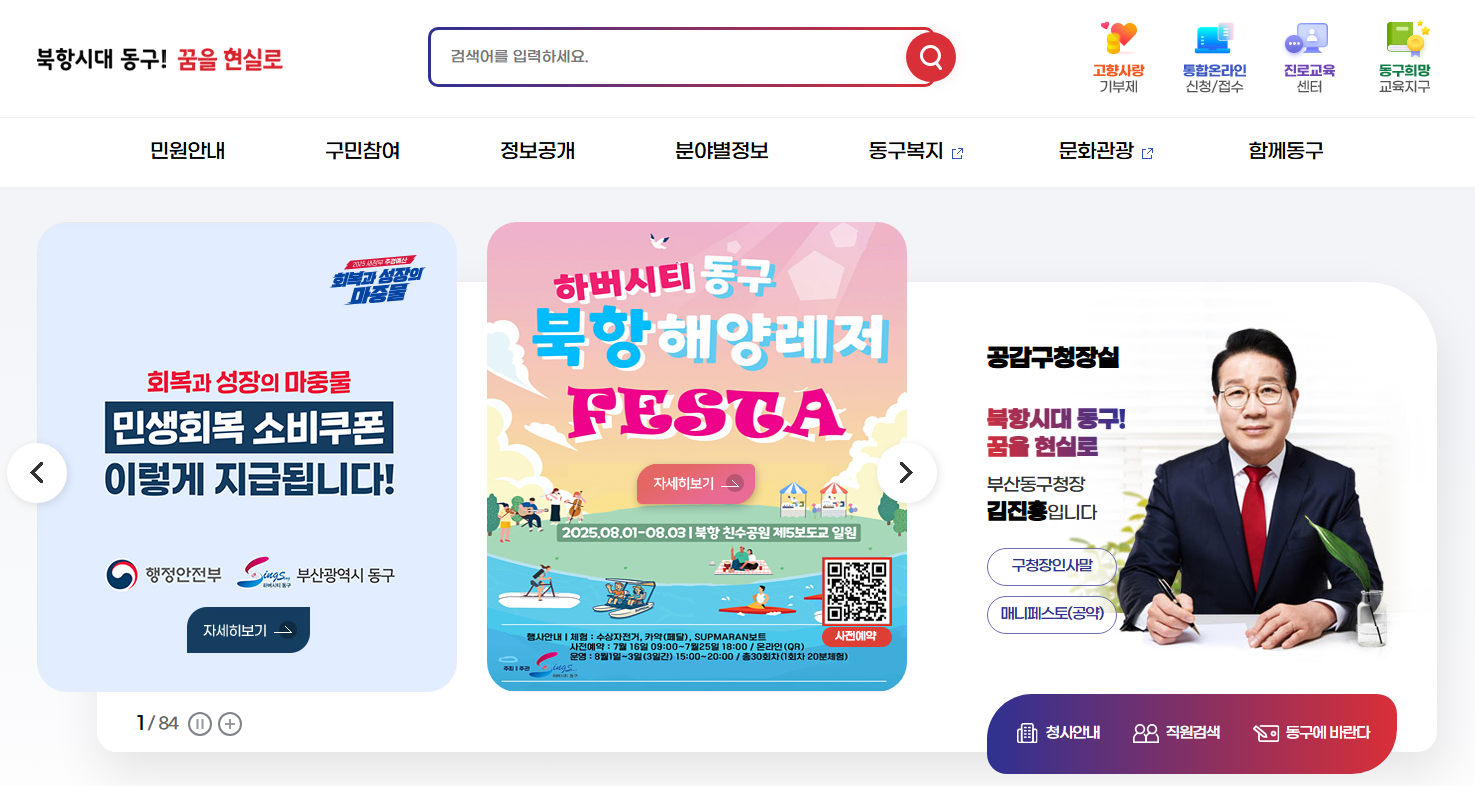 부산 동구청 홈페이지는 최신 웹 기술을 도입한 반응형 웹 디자인으로 제작되어 있습니다. PC뿐만 아니라 모바일, 태블릿 등 다양한 기기에서 최적화된 화면으로 이용할 수 있어 접근성이 뛰어납니다.
