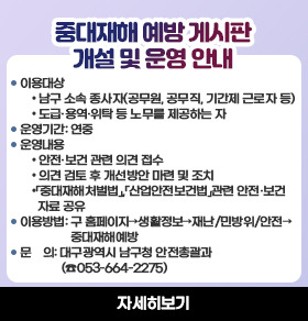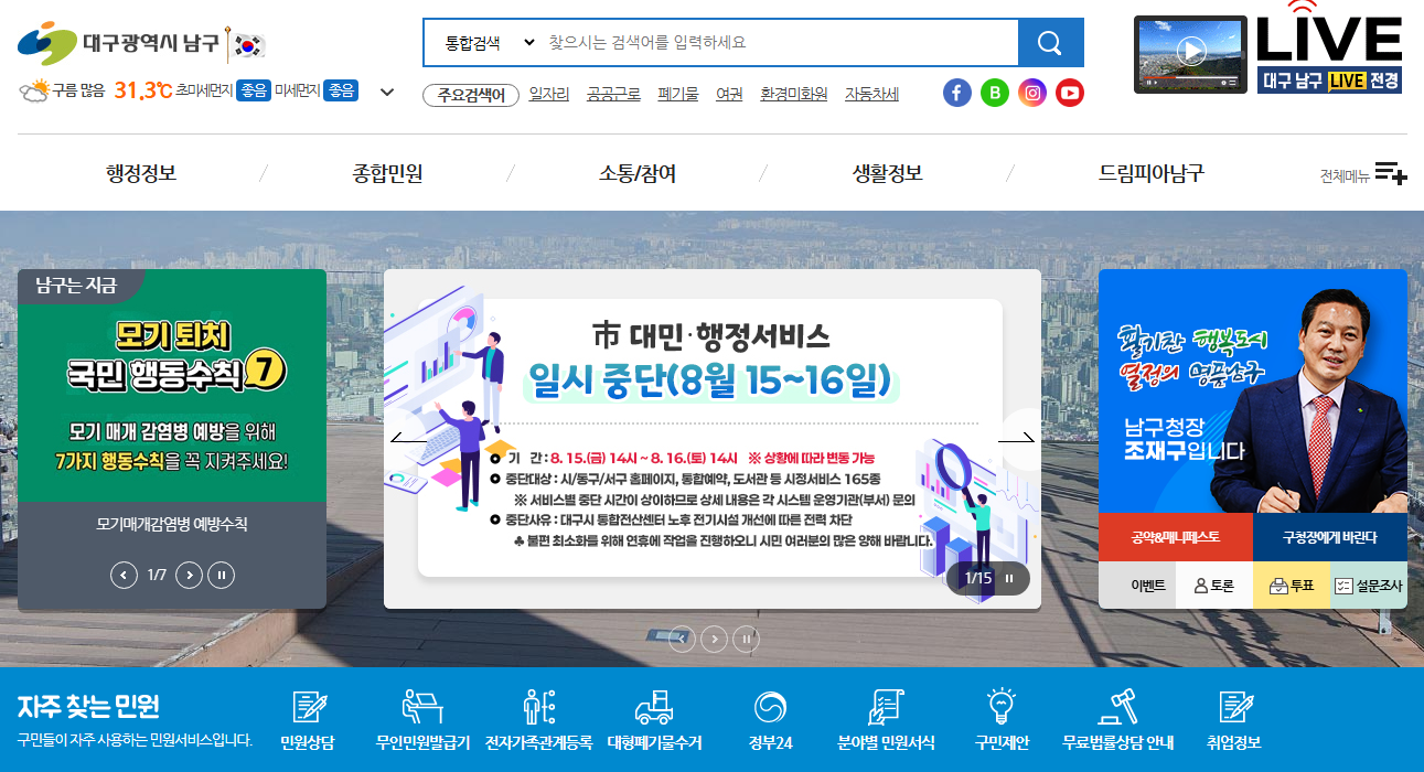 대구광역시 남구청 홈페이지는 남구 지역주민들을 위한 온라인 행정서비스 플랫폼이다. 봉덕동에 위치한 남구청 건물에서 제공하는 모든 행정서비스를 디지털화하여 주민들이 언제 어디서나 편리하게 이용할 수 있도록 구축되었다.