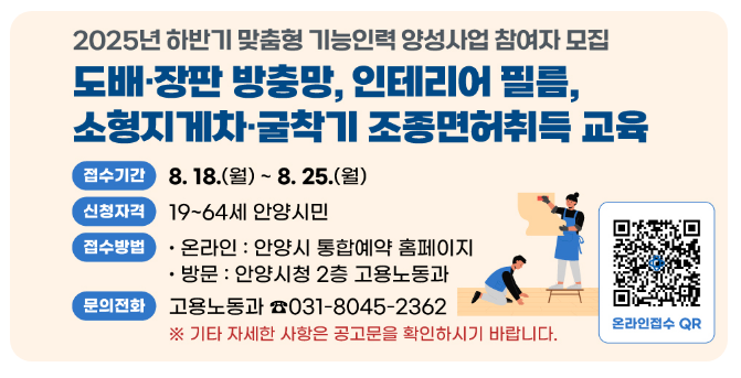 안양시청 홈페이지를 통해 다양한 취업 지원 프로그램을 제공하고 있습니다. 2025년 하반기 기준으로 맞춤형 기능 인력 양성사업을 운영하여 건설 분야 등에서 74명의 교육생을 모집하는 등 적극적인 일자리 창출 노력을 보이고 있습니다.