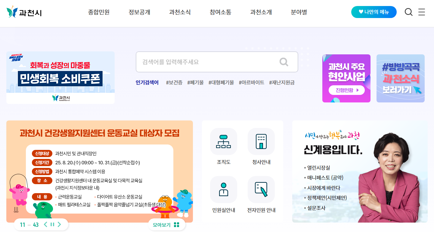 과천시청 홈페이지는 디지털 전환 시대에 맞춰 시민들에게 편리하고 투명한 행정서비스를 제공하는 핵심 플랫폼 역할을 하고 있습니다. 지속적인 시스템 개선과 서비스 확대를 통해 시민 만족도 향상에 기여하고 있습니다.