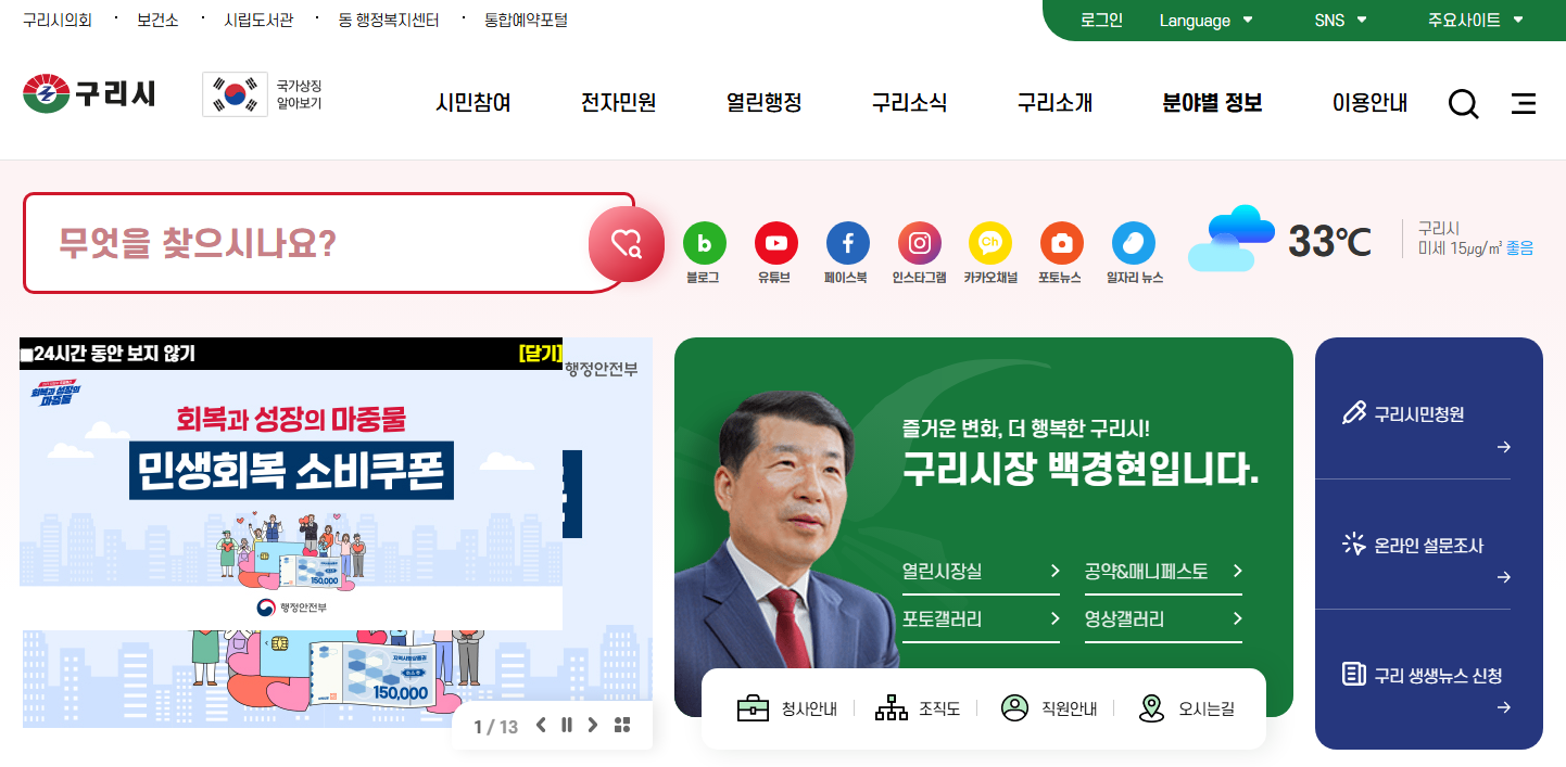 - 시정정보: 구리시의 주요 정책, 공지사항, 행사 안내